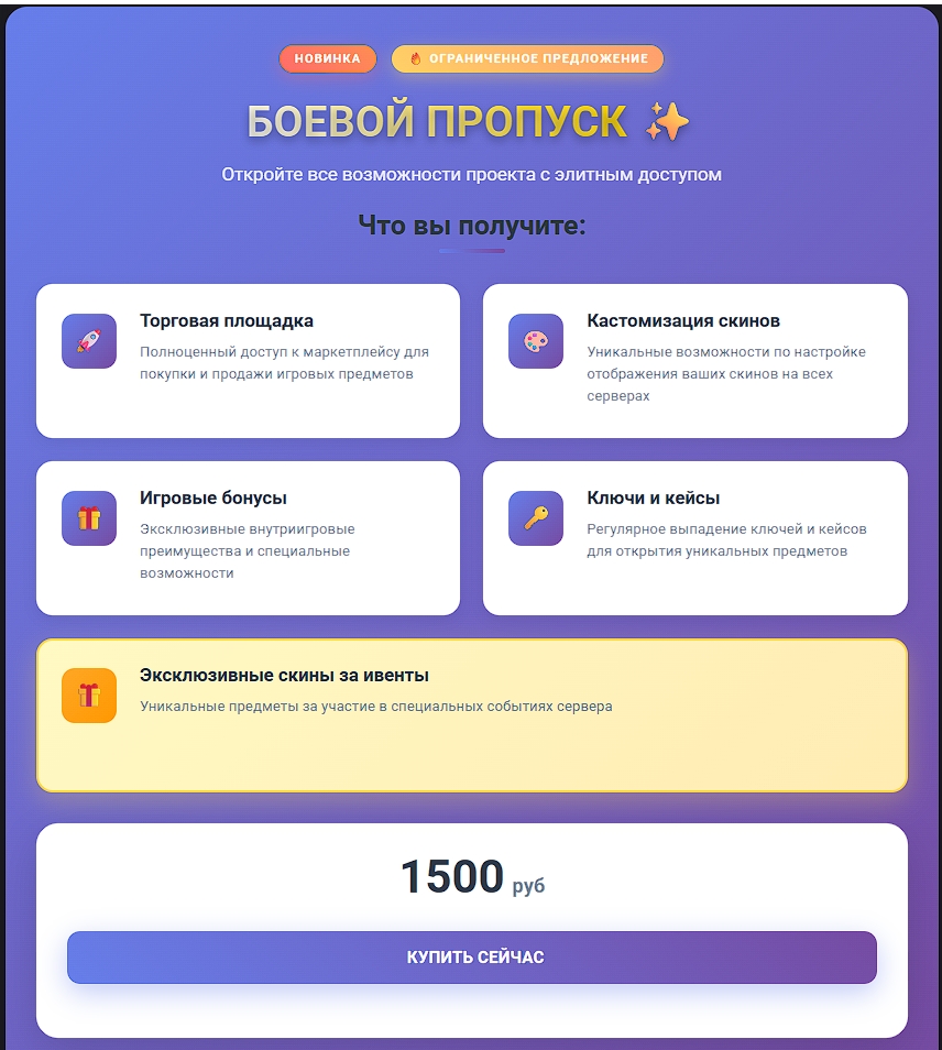 Не упусти шанс занять лучшие позиции на рынке. Приобретай EliteV Pass и будь готов к наплыву уникальных предметов!